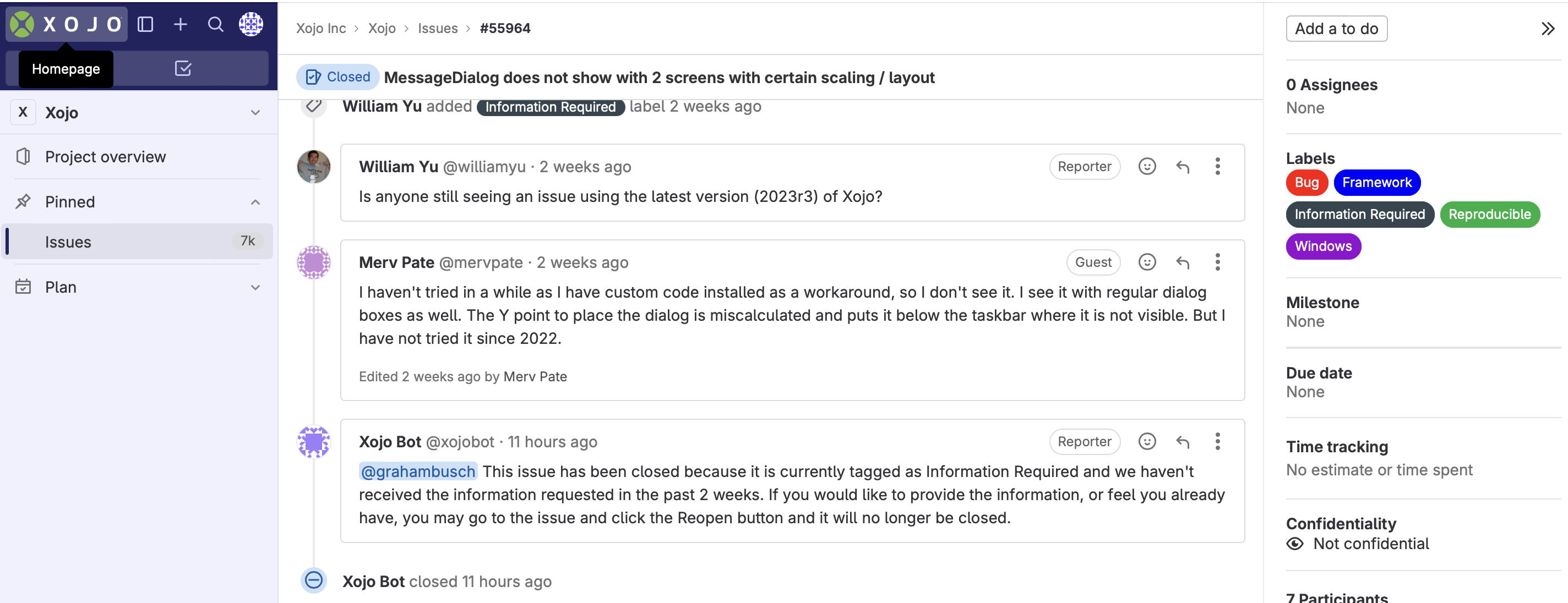 Xojo Bot still closing bug reports without any involvement of testing or QA in general, putting the blame on users contributing for free to bug chasing ‘This issue has been closed … information required and haven’t received…’