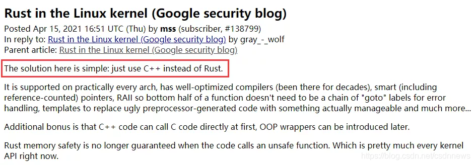 he may say that but he has only one alternative. Rust. And Rust is in the same way terrible. What you want to tell with it. When a rich man says something? Linus is not the same like he was. He is industry driven and paid with many $$$$ by the industry. And now? You mean that he is the new Einstein? No. And looking on that: C# would be in that criteria 100 times more terrible. So what? I can’t get what you want to say?