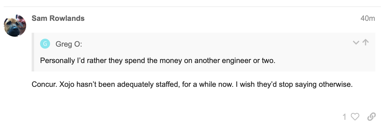 While Xojo has its own strengths and weaknesses like any other programming language, it’s important to evaluate its suitability for your project based on your specific requirements. Ultimately, the choice of programming language depends on the project’s scope, team skills, and resources. (comment by author: true!