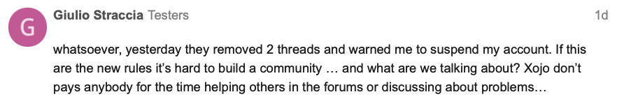 Am I seeing this correctly? Xojo manages to delete posts and warn users, but they can’t handle credit card payments or respond to messages?